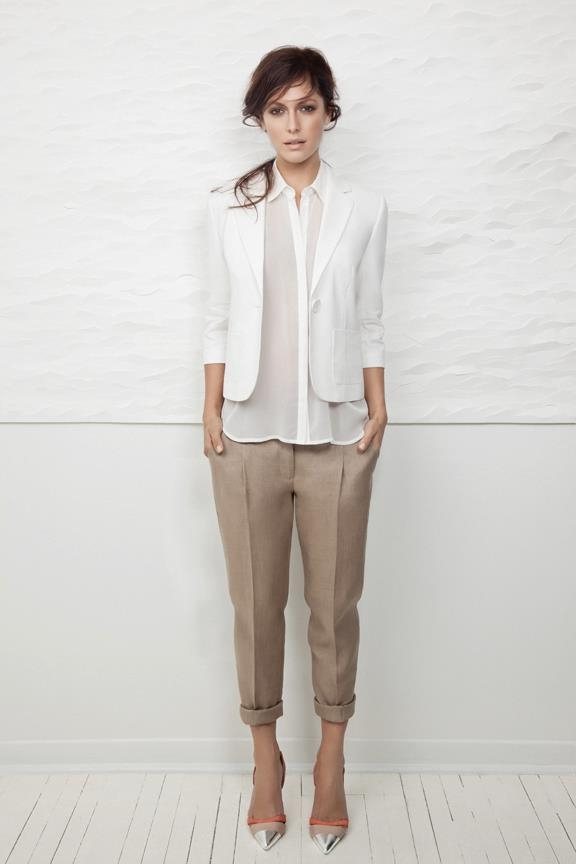 1 вариант. Белая блузка + укороченные бежевые брюки и белый пиджак