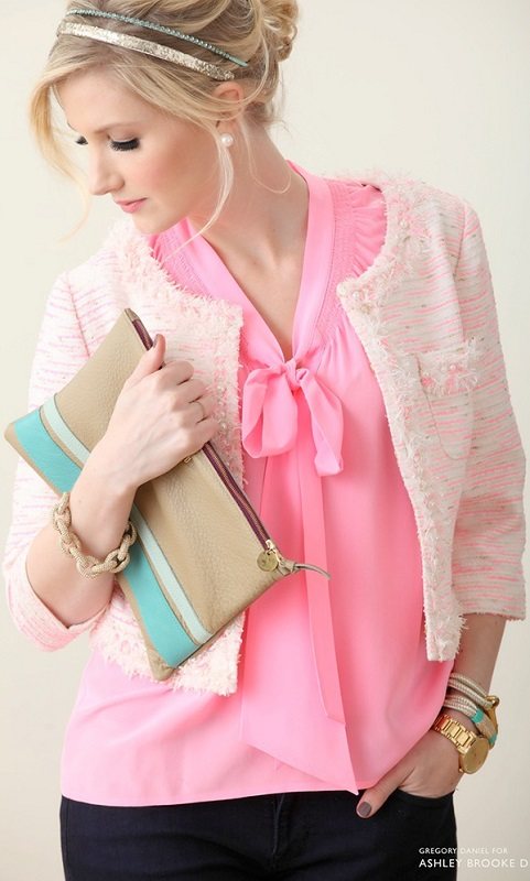 Итак, розовую блузку можно использовать для делового образа, но для этого ее необходимо разбавить чем-то нейтральным. Например, серым пиджаком и юбкой, черными брюками. Очень нежно смотрится сочетание с жакетом в стиле Коко Шанель