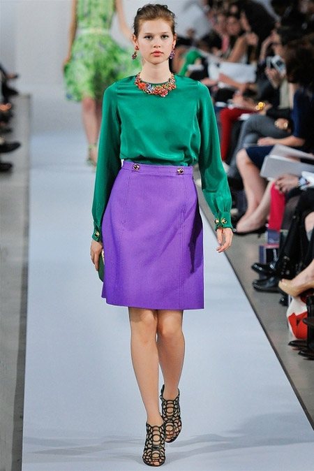Очень смелым, но, безусловно, крутым решением является лук, состоящий из зеленой блузки и сочной фиолетовой юбки. Вы точно не останетесь незамеченной. И вновь напоминаем про аксессуары. Для блузки этой главы подойдет коралловое колье, золотые браслеты и сережки, украшения и ремни из коричневой кожи.