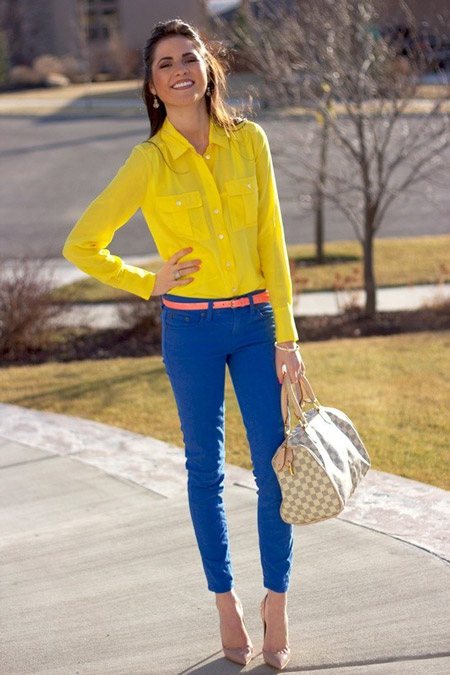 Для того чтобы придать образу весенне-летней свежести, ярких позитивных ноток на синюю блузку можно накинуть желтый пиджак или надеть изумрудную юбку. Но нам особенно нравится сочетание с оранжевыми шортами, оттенка самого спелого апельсина