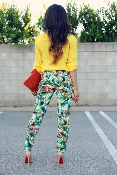 По-летнему задорно выглядит желтая или бледно-лимонная блузка в сочетании с брюками, на которых изображены пальмы, цветы и прочие принты самого жаркого сезона. На ножки лучше обуть незаменимые лодочки и взять в руки розовый, синий, красный, или изумрудный клатч