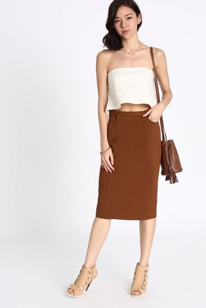 Коричневый цвет наиболее выгодно оттеняет классические линии юбок-карандашей. Они предусмотрены в гардеробе деловых дам для случаев, когда надо внести тонкую нотку женственности в суровый дресскод. Такая юбка хорошо сочетается с обувью на высоком каблуке. Только при безупречной фигуре можно носить ее с балетками.