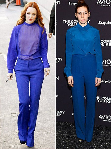 И последнее слово о синей блузке. Некоторые звезды в поисках смелых решений приходят порой к настолько простым, лежащим на поверхности сочетаниям, но, как показывает практика,они являются одними из самых удачных и необычных. Взгляните хотя бы на Рейчел Макадамс и Зосю Мамет: