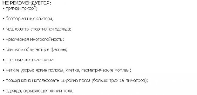 Золотые правила * Вам понадобятся мягкие, легко драпирующиеся ткани, которые будут струиться по телу, акцентируя его изгибы. * Талия непременно должна оставаться фокусной точкой для взглядов. * Избегайте одежды, скрывающей линии вашего тела, т. к. она может визуально добавить вам 3-4 килограмма. Следует избегать: * Жакетов прямого покроя; * Брюк и юбок не по фигуре; * Туник прямого покроя; * Бесформенных свитеров; * Мешковатой спортивной одежды;