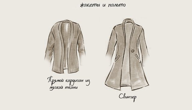 Золотые правила * Минимальное количество деталей на линии плеч, здесь все должно быть максимально просто и сдержанно; * Покрой одежды должен быть прямым и четким; * Привлекать внимание к области бедер и ног; * Силуэт должен хорошо «читаться». Следует избегать: * Оборок и рюшек; * Драпировки в области талии; * Ярусных юбок; * Погон и эполет; * Мягких, свисающих и пушистых тканей; * Косого кроя.