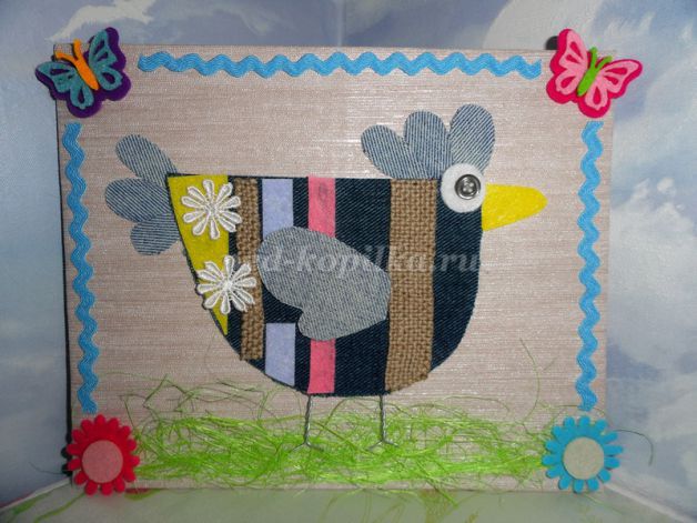 Автор: Орехова Вера Александровна, воспитатель МБДОУ «Детский сад общеразвивающего вида № 125», г. ВоронежОписание: данный мастер-класс предназначен для детей от 6 лет, воспитателей, педагогов дополнительного образования и просто творческих людей. Назначение: украшение интерьера, подарок. Цель: Изготовление панно из кусочков джинсовой ткани Задачи: 1.Развивать мелкую моторику рук, глазомер, чувство формы; 2.Развивать творческие способности, фантазию, воображение; 3.Развивать наглядно-образное мышление, композиционные и эстетические чувства; 4.Воспитывать привычку работать аккуратно, доводить начатое дело до логического завершения; 5.Развивать интерес к декоративно-прикладному творчеству. КУРИЦА (Корней Чуковский) Курица-красавица У меня жила. Ах, какая умная Курица была! Шила мне кафтаны, Шила сапоги, Сладкие, румяные Пекла мне пироги. А когда управится, Сядет у ворот — Сказочку расскажет, Песенку споёт.