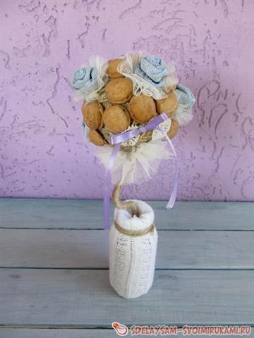 С нижней стороны шара вставьте ствол и декорируете его шпагатом. Украсьте основу розами и половинками грецкого ореха. Для этого нужно приклеить их к шару на горячий клей.