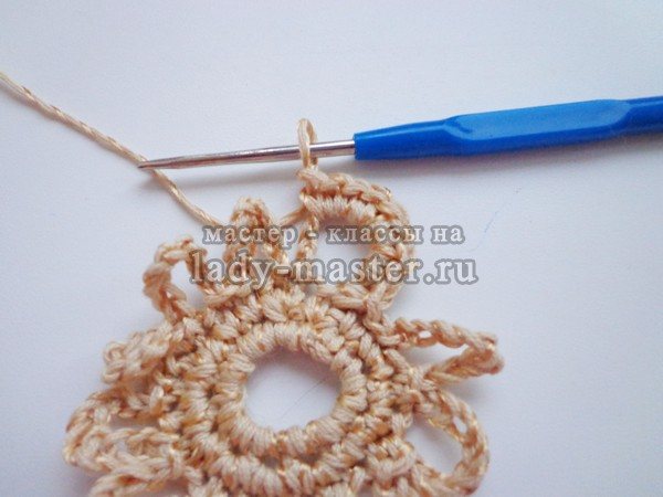 Заведите крючок под лепестком. Протяните одну петлю в другую и перейдите на обвязку лепестков.