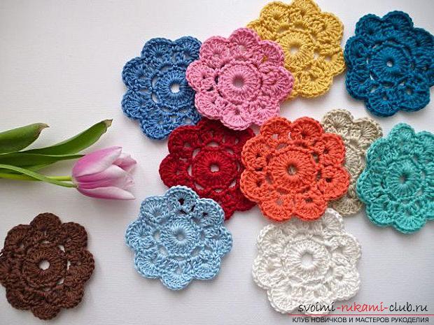 Вязаные крючком цветы могут быть и маленькими, и большими. С их помощью можно сделать декор абсолютно любой вещи. Цветами можно украсить не только салфетку, но и подхват для штор, сумку, шапку, шарф или варежки. С помощью вязаных цветов можно придать дополнительную красоту Вашей прическе, сделать вместе с детьми красивые открытки. Одним словом, подключайте фантазию, и творите великолепные вещи!
