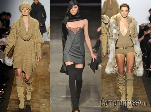 . Например, прекрасно смотрится на женщине трикотажное платье-мешок с вязаными гамашами, натянутыми на грубые ботинки на шнуровке. Смотрится свежо и даже молодежно, но не перегибая палку.