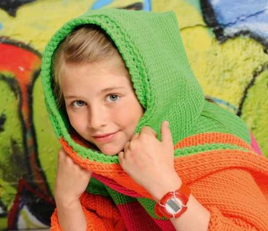 Дети и подростки с удовольствием носят шарфы капюшоны, поэтому стоит рассмотреть вязание спицами детского шарфа капюшона на примере аксессуара для девочки.