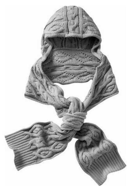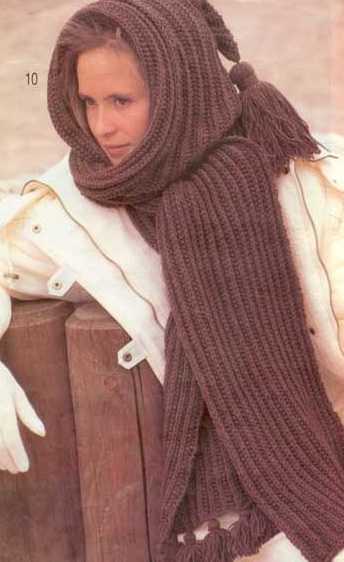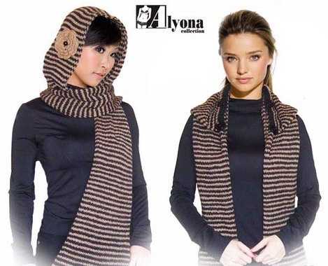 Если ваше зимнее пальто или курточка не имеют капюшона, то такой шарф будет очень кстати. Кроме того, при наличии в гардеробе шарфа капюшона, вы сохраните прическу в порядке. В отличие от шапки или берета, вязаный спицами капюшон не нанесет волосам никакого вреда, ничего не разрушая. Ко всем своим преимуществам, он является очень стильным и эффектным, дополняя образ и формируя оригинальный стиль, присущий только вам.