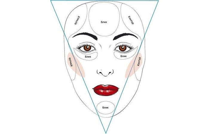 Правильное распределение тональной основы — залог успеха корректирующего макияжа. Визажисты рекомендуют затемнить верхнюю границу лба, боковые части носа, места в области выступов скул. Высветляют центр лба, спинку носа, щеки, подбородок.