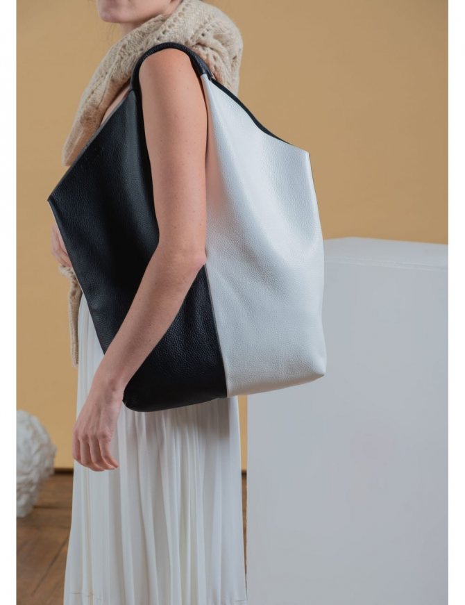 - Сумка-ковш. Бесформенный шоппер с длинной ручкой, плотным дном. По внешнему виду напоминает огромный кисет.