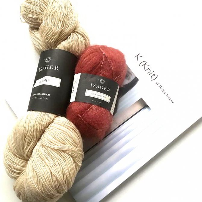 В компаньоны к шерсти потребуется тонкий мохер Isager Silk Mohair (70% мохер, 30% шелк, 212 метров в 25 граммах): 125 (150: 175: 175) граммов кораллового цвета 28.