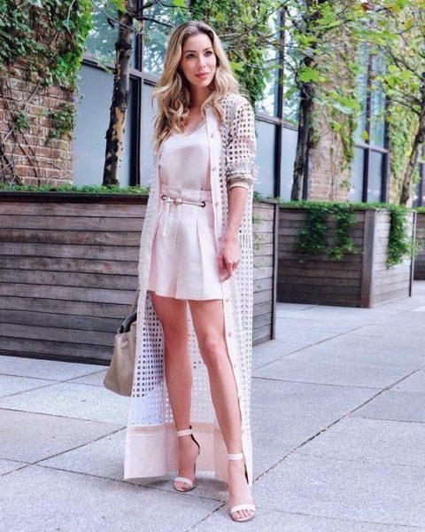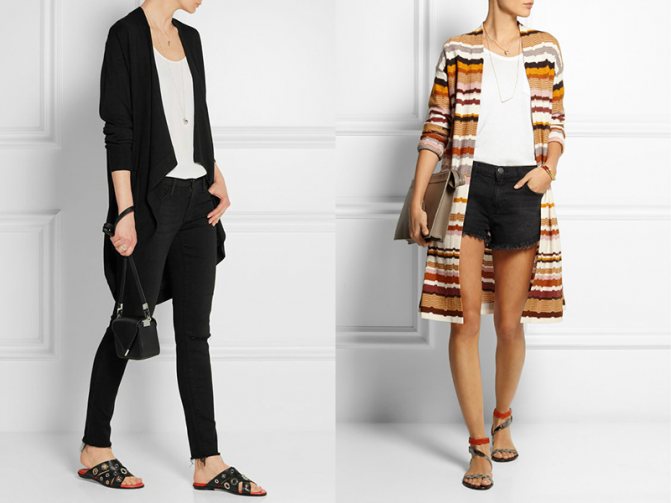 - Длинные кардиганы с запахом, объемные вязанные, из легких материалов и ажурные, прекрасно будут выглядеть с короткой юбкой.