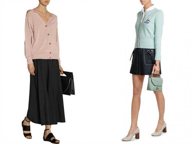 Кардиганы подходят для создания богемного или элегантного ансамбля. В этом случае завершением образа станут лакированные клатчи, сумки-конверты на жесткой основе, шкатулки на металлической цепочке, сумки минималистичного дизайна с узором рептилий. Неплохим решением на каждый день станет сумка-хобо из замши или мягкой кожи. Повседневный аутфит разнообразит сумка-седло на длинном ремешке.