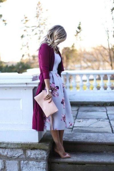 - Юбки миди носятся с кардиганом такой же длины или немного короче.