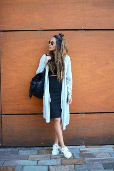 Обувь также должна соответствовать созданному стилю и цветовой гамме. Кроссовки с юбкой плюс кардиган — модное современное решение.