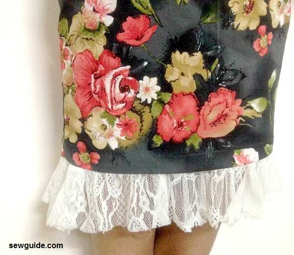 Сделайте полукомбинезон до середины бедра и затем добавьте кусок присборенного кружева. Соберите кусок шнурка по размеру нижнего края комбинезона + 1 дюйм (припуск на шов). Начните прикреплять этот кусок булавками с обратной стороны комбинезона.Затем приколите все это по нижнему краю и, когда снова дойдете до начала, перекрывайте их на 1/2 дюйма и закрепляйте булавками. Открепите эту область и соедините кружевные части, сшив вместе с припуском на шов 1/2 дюйма. Пришейте кружево к подолу юбки по линии подола.