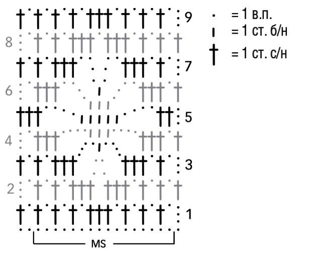 Начало каждого рядка вяжем по схеме, с 3 ВП подъема вместо 1 ССН и с петельки перед раппортом, который повторяем на весь рядок. Завершаем петельками после раппорта. С 1р. по 9р. выполняем однократно, далее повторяем со 2р. по 9р.