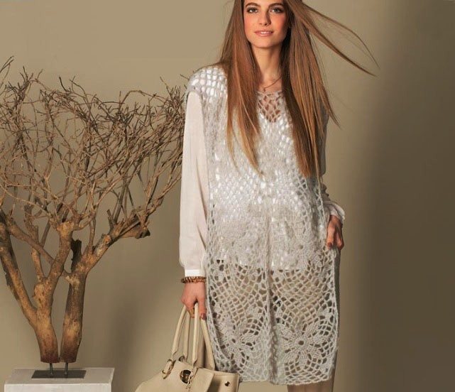 Выполнить вязание 12 мотивов=6 штук для переда + 6 штук для спинки. Соединить их между собой по выкройке. По верхнему краю оставляем разрыв в 22см для горловины. По краям все изделие обвязываем рачьим шагом, выполнив слева направо стлб без накида.