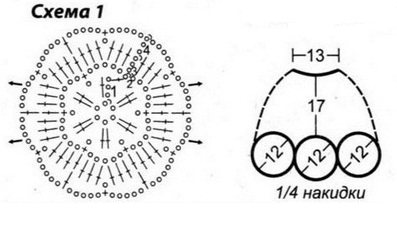 Вязание накидки выполняем крючком, руководствуясь схемами. Начинаем со схемы No2. Вывязываем длинную, с запасом, цепочку из воздушных петель. На ней нужно связать 15 или 16 (по вашему выбору) раппортов узора схемы No1. Затем делаем примерку, после которой лишние ВП исходной цепочки отрезаем.