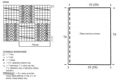 Выполняете согласно выше приведённой схеме. Изнаночный ряд – изнаночные петли. Начинаете с кромочных, опять петельки раппорта, заканчиваете петлями после него и кромочными. Повторяете с 1-28 ряд.