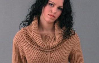 Итак, мы рассмотрим первый способ вязания воротника «Хомут». В уроке содержится выкройка для этой модели, на которую вам необходимо обратить внимание. Набор производится из петель горловины, круговым методом. Если сравнивать провисающий хомут с моделью «Гольф», то первый должен быть шире, и не находиться близко к шее. В нашем случае потребуется набрать девяносто две петли. Из них пятьдесят штук пойдут на переднюю половину, а сорок две на заднюю. Вяжем примерно десять сантиметров выбранным узором, затем начнем прибавления в передней части. Для этого из каждой пятой петли делаем две. Таким способом мы получаем в передней половине шестьдесят штук. После этого выполним еще десять сантиметров вязания с имеющимися ста петлями, и потом все вязание закрываем. В итоге такого способа ваш воротник «Хомут» имеет небольшое провисание в передней части, что очень красиво и эффектно выглядит.