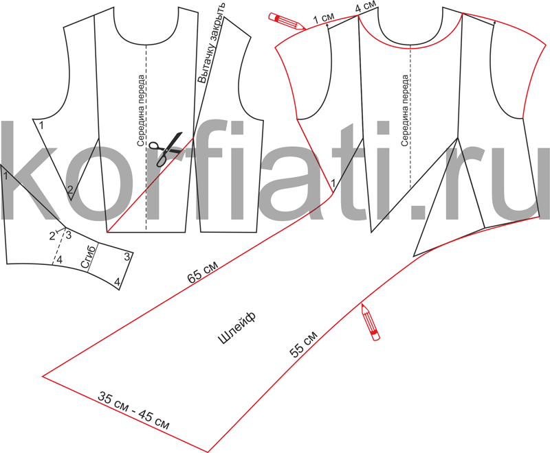 Расширим и углубим горловину. После этого нужно наметить вырез на горловине полочки. Вытачку на грудь сократить по длине на 2 см.